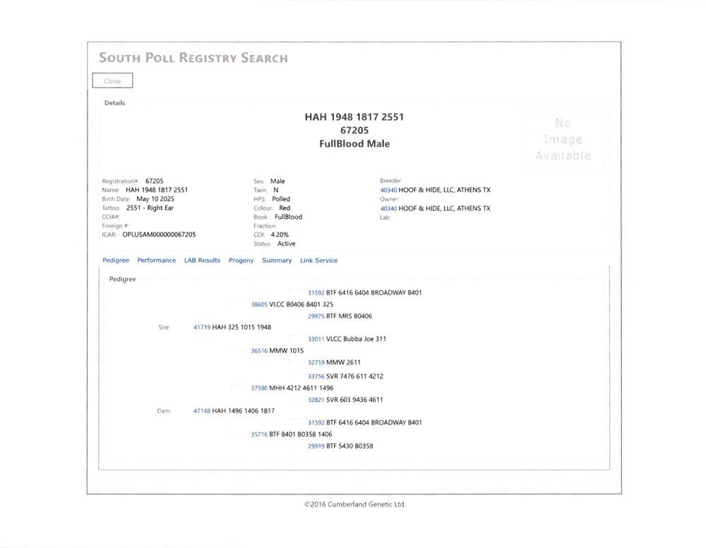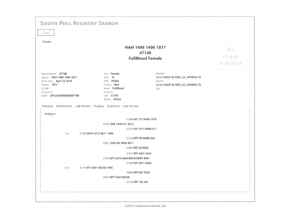 Fullblood South Poll Cow 1817 is a 7-year-old cow. She was born on our ranch in 2018. We have retained her 2023 bull calf as one of our main herd sires. We are selling her for simplicity's sake. We don't want him to breed his own dam. This is a great opportunity to get a quality cow for your own herd along with a potential bull for your herd.