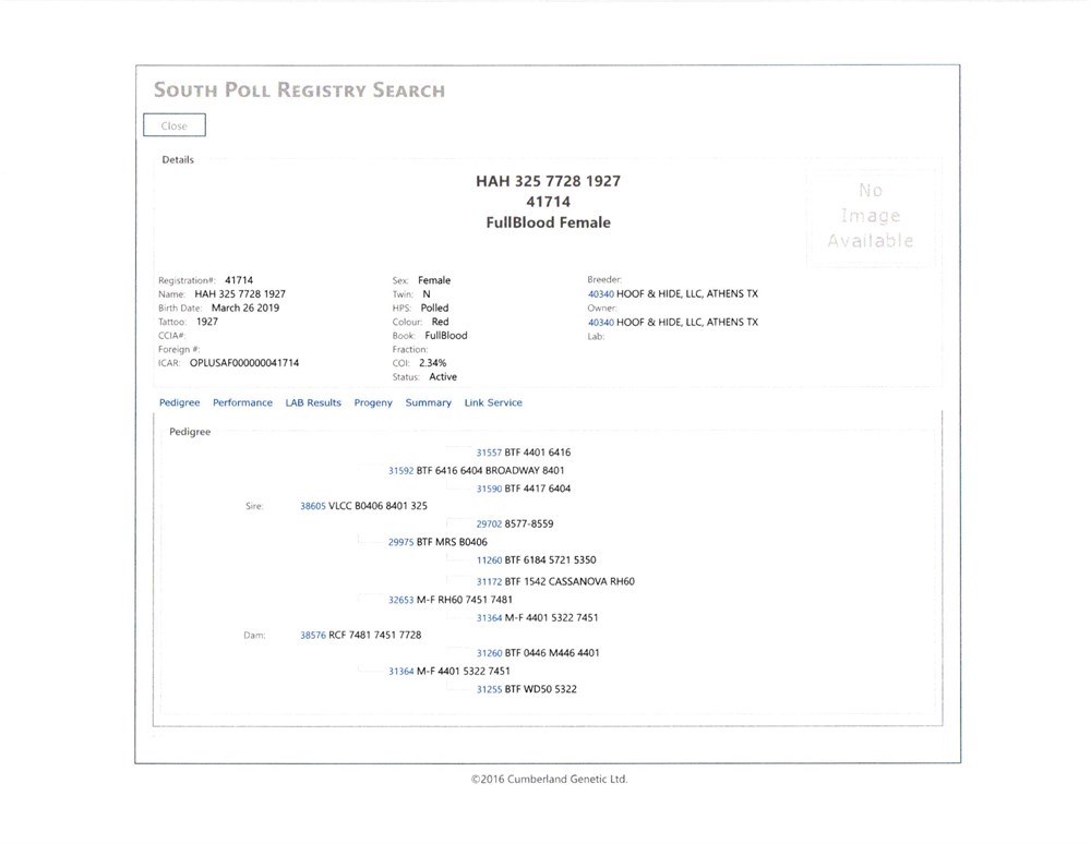 Fullblood South Poll Cow 1927 is a 6-year-old cow. She was born on our ranch in 2019. Cow 1927 has never missed a calf. We sold her 2023 calf as a breeding bull. We have retained her 2024 heifer calf as a replacement for our herd. Cow 1927 is a granddaughter of Broadway and a great-granddaughter of Casanova. She weighed 1110 lbs on 10/6/2025. She has not been exposed to a bull since calving and is ready for your bull.