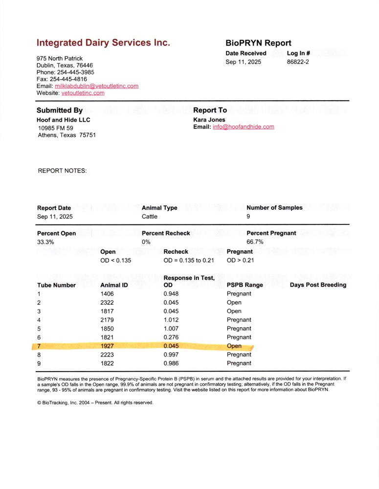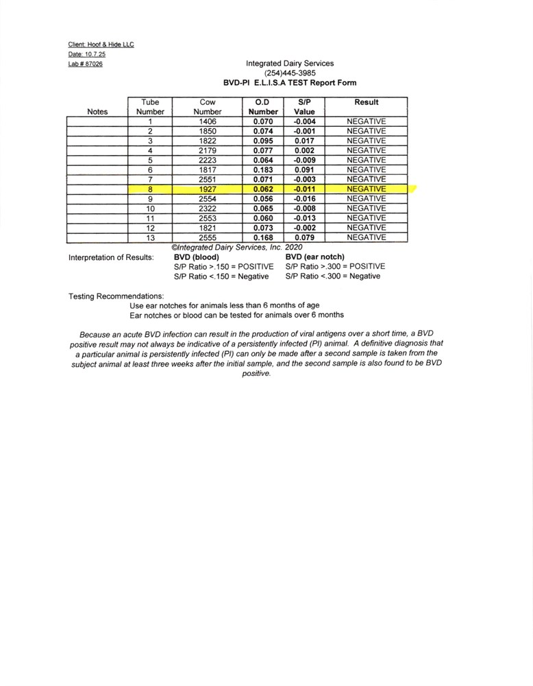 This pair is exclusively grass-fed, eating grasses such as coastal bermuda and behia and cover crops along with hay in the-off season and quality minerals year-round. They have been rotationally grazed, moving daily behind a single strand of hotwire. Both 1927 and 2554 have tested negative for BVD PI.