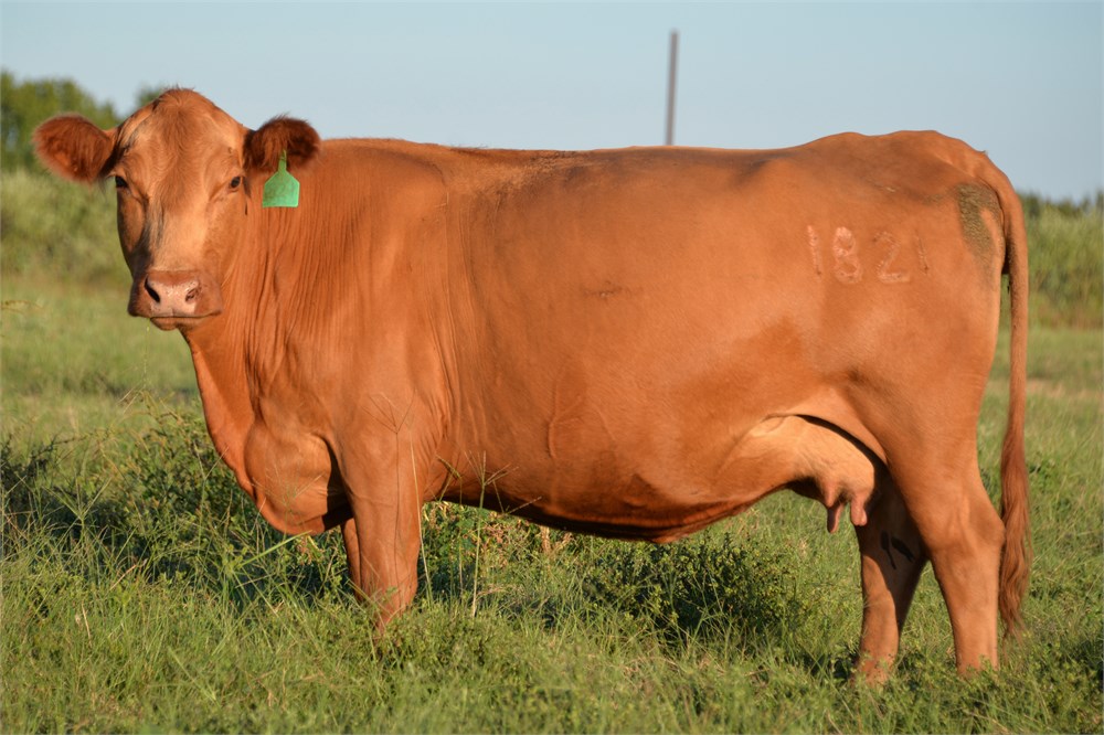 Please Note: We originally listed this cow as a 3-in-1 as a bull had gotten out for two days and an initial pregnancy test showed her pregnant. However, a 2nd confirmatory pregnancy test has come back negative. We are now selling her as an open cow with a heifer calf on her side. Change made on 10/8/25. Bred 75% South Poll Cow 1821 is a 7-year-old cow. She was born on our ranch in 2018. Cow 1821 has never missed a calf. She is a granddaughter of Romeo and a great-granddaughter of Chief and Dandy. She weighed 1130 lbs. on Oct 7th. Please note that this cow is a more timid cow and prefers to be in a group. She will not be happy in a homestead situation where she is the only cow or in a group of only two or three. She is not a mean cow and you can tag her calf just fine, but she likes some distance between her and you and prefers to have cow friends around at all times.