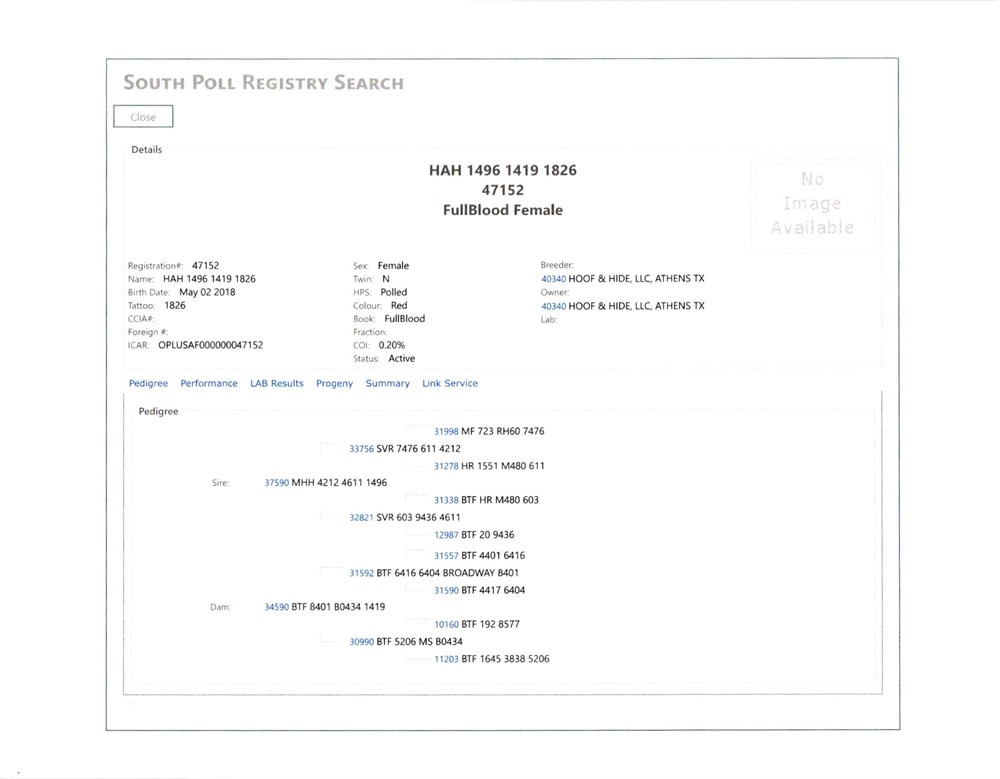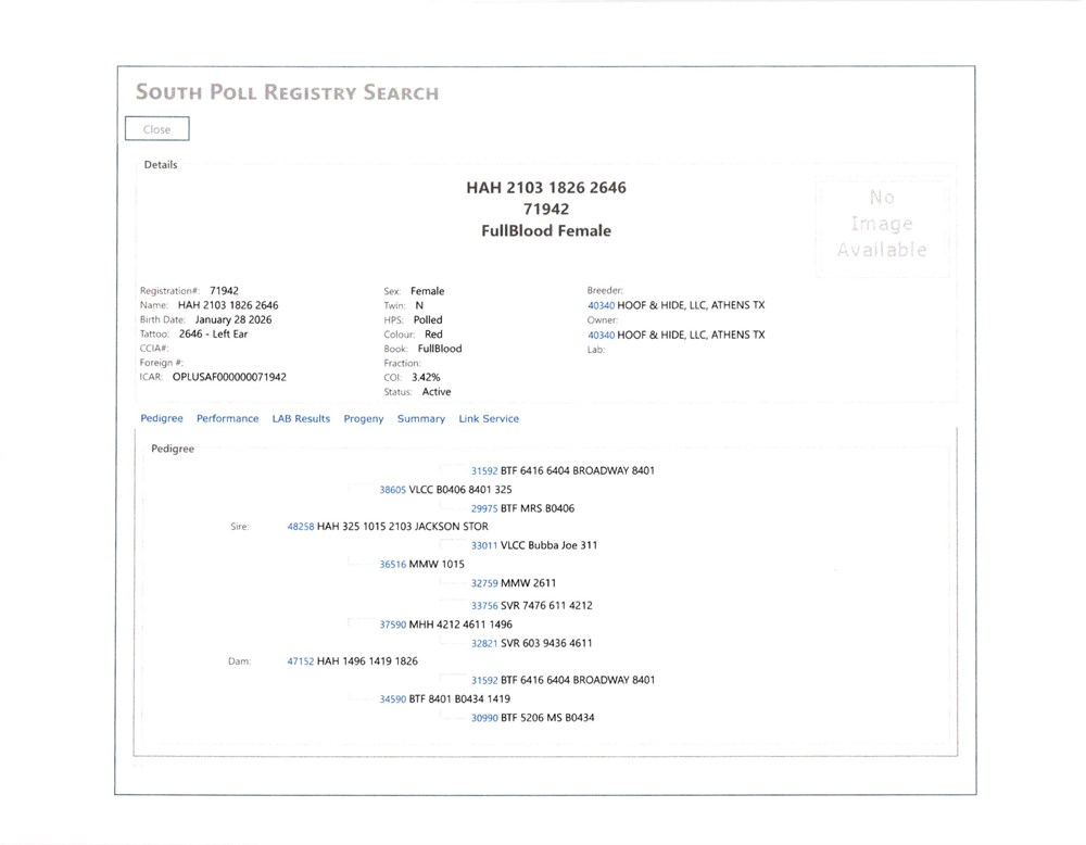Fullblood South Poll Cow 1826 is an 8-year-old cow. She was born on our ranch in 2018. 1826 is a granddaughter of Broadway and also sports lineage from Chief. 1826 is a smaller cow, weighing approximately 885 lbs. on 3/18/2026. She struggles a little to keep weight on herself but gives it all to her calves. Every one of her last five calves born here has weaned at over 50% of her body weight. We have selected her 2025 calf to keep as one of our replacement heifers. Cow 1826 has not been exposed to a bull since calving and is ready for your bull.