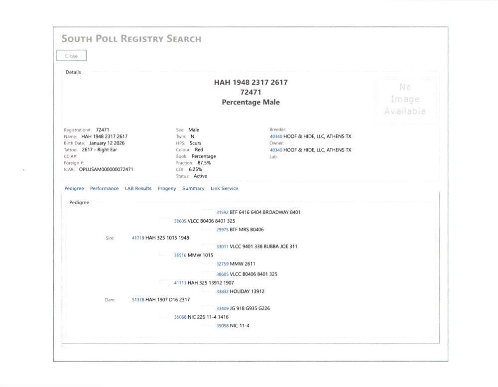 Bull Calf 2617 was born on January 12th weighing 55 lbs. We think it is kind of neat that 2317 was the 17th calf born in 2023 and her calf was the 17th born this year. Calf 2617 is a son of our Bull 1948. You can see information on Bull 1948 by clicking here. On 4/16/2026, calf 2617 weighed approximately 230 lbs.