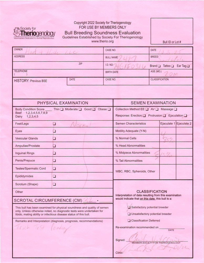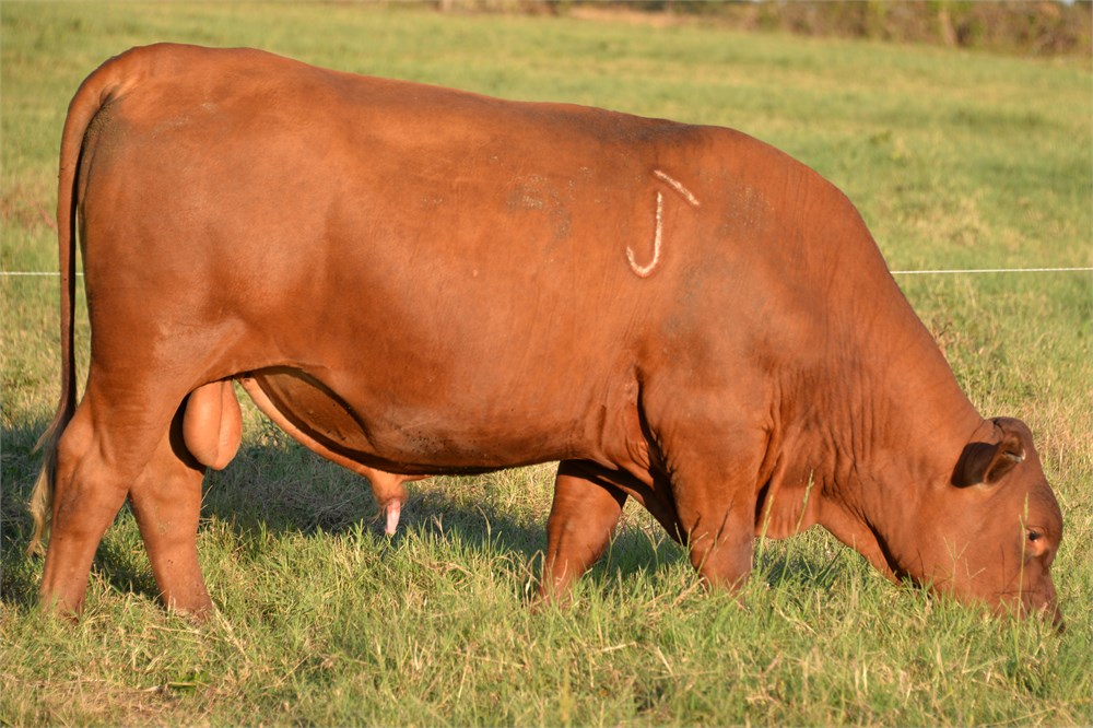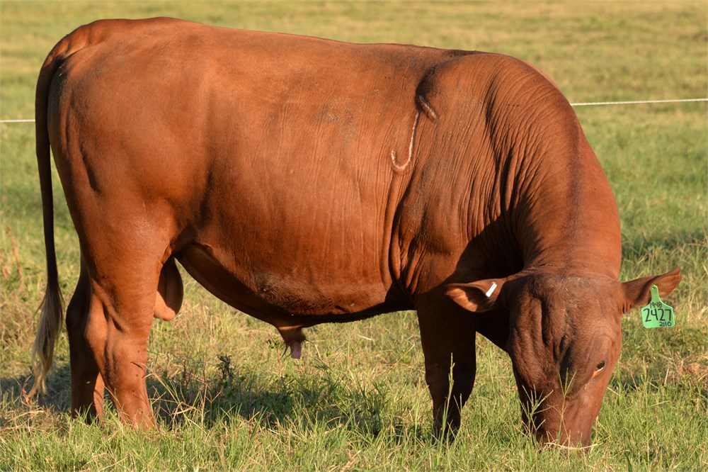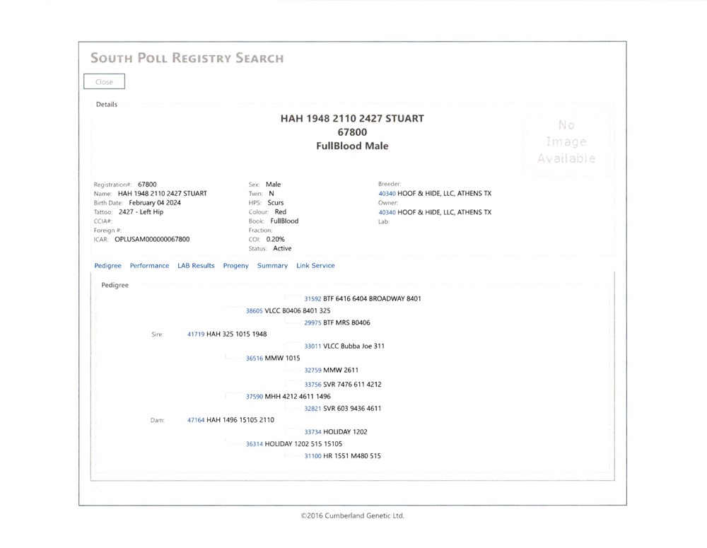 Bull 2427 "Stuart" (Reg # 67800) is a Fullblood 100% South Poll. He was born on our ranch on February 4, 2024 weighing 72 lbs. He descends from Broadway, Bubba Joe, and Chief. Stuart's dam was a 2nd calf heifer when she had him. She is remains in our herd and is bred back to calve again in 2026. Stuart's sire is Bull 1948 (you can see a picture of Bull 1948 here). Stuart's grandmother is Cow 1015, a 10-year-old cow we bought in 2016 as a 14-month-old heifer. She has produced four bulls for us, three of which we have used on our herd. Stuart is a good tempered bull that stands behind one strand of hotwire and is rotationally grazed. He has been exclusively grass-fed and had access to quality minerals. He is a virgin bull. This bull is not part of our current auction and is first-come-first serve private treaty. Call us at 903-681-4211 to schedule a viewing, ask questions, or to purchase the bull. His trich test is pending and should be ready the week of 10/13/25.