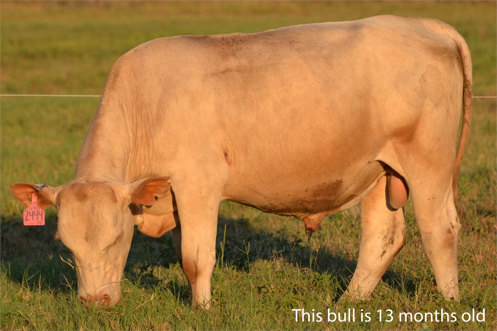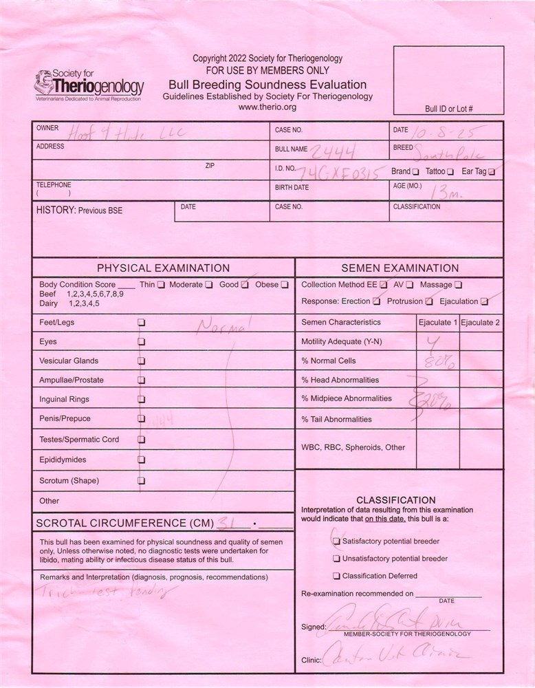 Bull 2444 "Spencer" (Reg Pending ) is a 75% South Poll owned by our daughter. He is 25% Beefmaster. He was born on our ranch on August 31, 2024 weighing 70 lbs. His sire is our herd bull 6400 (you can see a picture of Bull 6400 here ). He descends from Romeo and Dandy. Spencer's dam is a 4-year-old cow that bred back to calve again in 2026. Spencer is a good tempered bull that stands behind one strand of hotwire and is rotationally grazed. He has been exclusively grass-fed and had access to quality minerals. He is a virgin bull. This bull would be a good fit for a commercial grass-fed operation. This bull is not part of our current auction and is first-come-first serve private treaty. Call us at 903-681-4211 to schedule a viewing, ask questions, or to purchase the bull. We had to pull Spencer out of his calf crop early because he was trying to breed the others. He has passed his breeding soundness exam at 13 months old. His trich test is pending and should be ready the week of 10/13/25.