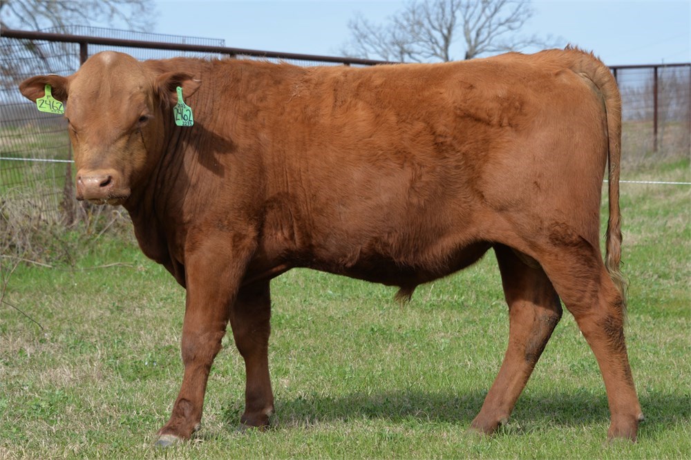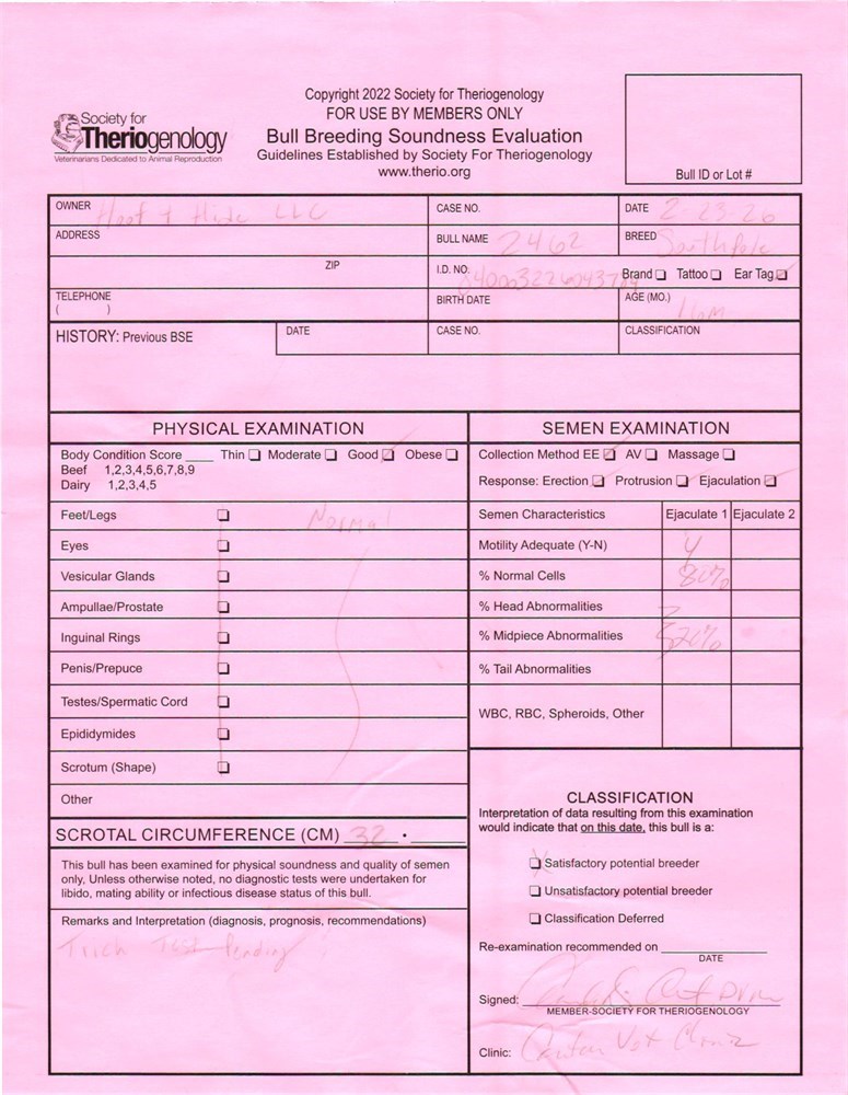 Bull 2462 is a good tempered bull that stands behind one strand of hotwire and is rotationally grazed. He has been exclusively grass-fed and has had access to quality minerals. He is a virgin bull. Scroll through his photos to see his breeding soundness exam. His trichomoniasis and BVD PI tests are pending lab results and are expected within the week. Call us at 903-681-4211 to schedule a viewing or to purchase the bull.