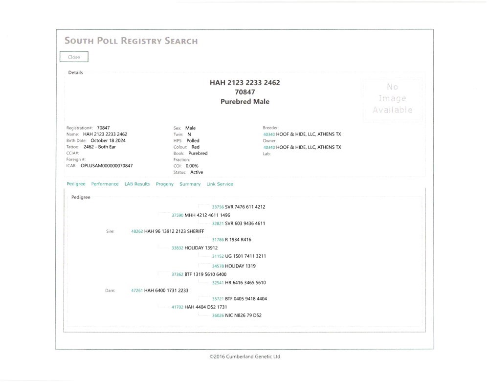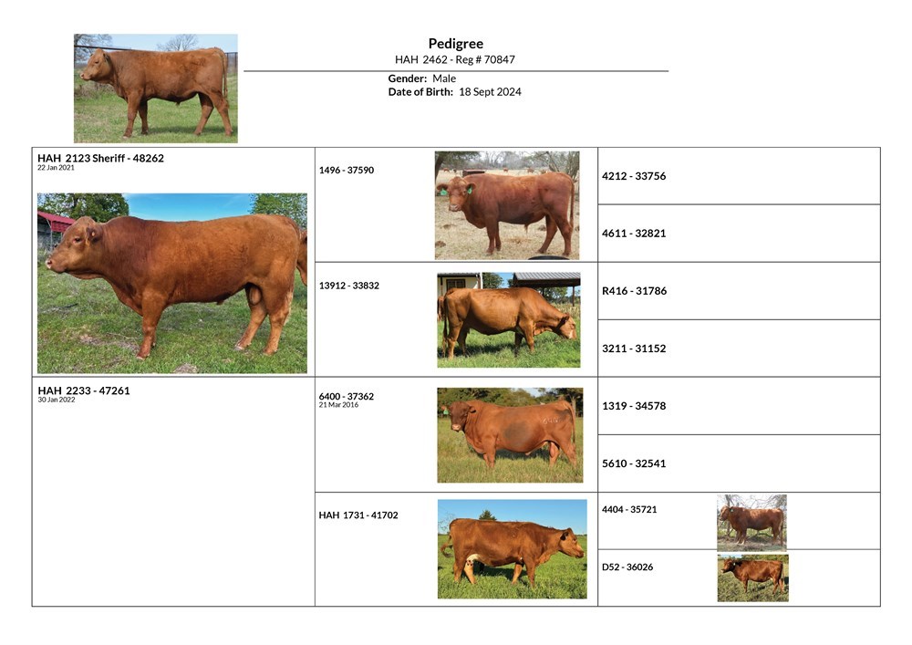 Bull 2462 (Reg # 70847) is a Registered Purebred South Poll. He was born on our ranch on October 18, 2024 weighing 55 lbs. He just turned 16 months old. On his dam's side, he is 4th generation Romeo and his grand-sire is 6400 (you can see a picture of Bull 6400 here). On both his dam and sire's sides he is descended from Chief. His dam was a first calf heifer. She rebred and is still in our herd. She just dropped a heifer calf that we are excited about.
